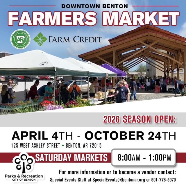 The Benton Farmers Market is operational between the first Saturday in April and will run until the last Saturday in October from 8:00am-1:00pm. To become a vendor please review the Farmers Market Guidelines and contact Special Events at specialevents@bentonar.org or 501-776-5970.